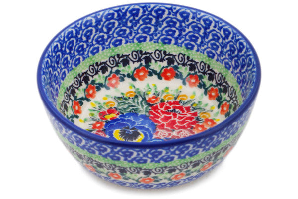 This Folk Meadow 5" Bowl was handmade and hand decorated in Boleslawiec, Poland by skilled artisans according to old traditional methods. This is a Polish pottery Signature Unikat, which means that it has been hand painted with both sponges and brushes and it is signed by the artist who painted it. Unikat pieces are the most intricate works of art. Larger Unikat items take hours of very careful work to finish. This Polish stoneware is microwave, dishwasher, freezer, and oven safe up to 480°F. It does not contain lead or cadmium. It is part of the Folk Meadow Collection.