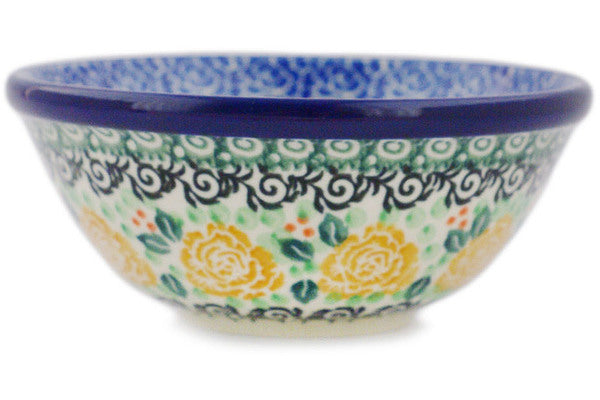 This Iris Bouquet 5" Bowl was handmade and hand decorated in Boleslawiec, Poland by skilled artisans according to old traditional methods. This is a Polish pottery Signature Unikat, which means that it has been hand painted with both sponges and brushes and it is signed by the artist who painted it. Unikat pieces are the most intricate works of art. Larger Unikat items take hours of very careful work to finish. This Polish stoneware is microwave, dishwasher, freezer, and oven safe up to 480°F. It does not contain lead or cadmium. It is part of the Iris Bouquet Collection.
