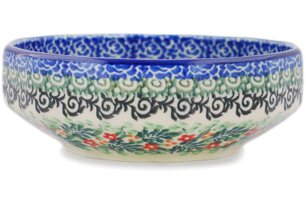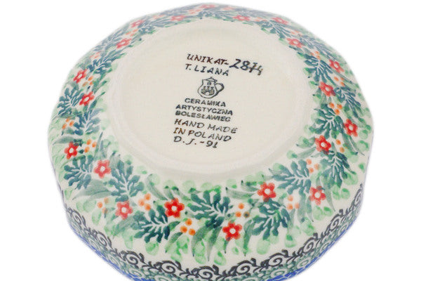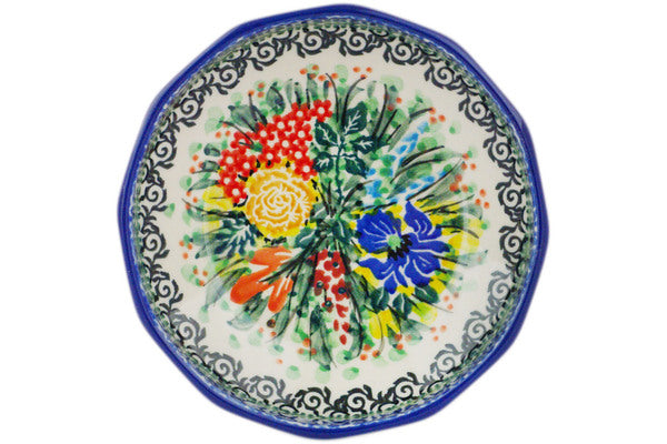 This Iris Bouquet 5" Bowl was handmade and hand decorated in Boleslawiec, Poland by skilled artisans according to old traditional methods. This is a Polish pottery Signature Unikat, which means that it has been hand painted with both sponges and brushes and it is signed by the artist who painted it. Unikat pieces are the most intricate works of art. Larger Unikat items take hours of very careful work to finish. This Polish stoneware is microwave, dishwasher, freezer, and oven safe up to 480°F. It does not contain lead or cadmium. It is part of the Iris Bouquet Collection.