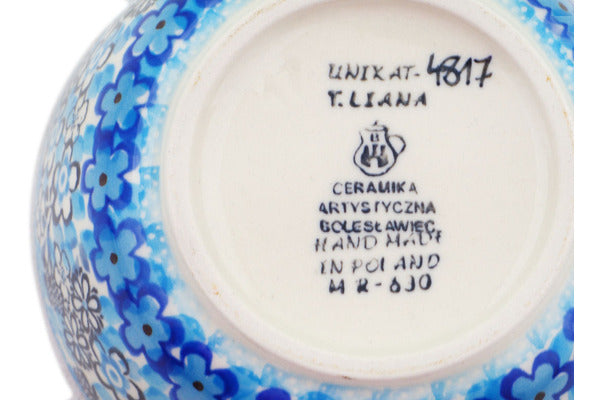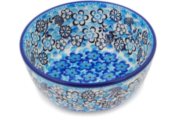 This Out Of Blue 5" Bowl was handmade and hand decorated in Boleslawiec, Poland by skilled artisans according to old traditional methods. This is a Polish pottery Signature Unikat, which means that it has been hand painted with both sponges and brushes and it is signed by the artist who painted it. Unikat pieces are the most intricate works of art. Larger Unikat items take hours of very careful work to finish. This Polish stoneware is microwave, dishwasher, freezer, and oven safe up to 480°F. It does not contain lead or cadmium. It is part of the Out Of Blue Collection.