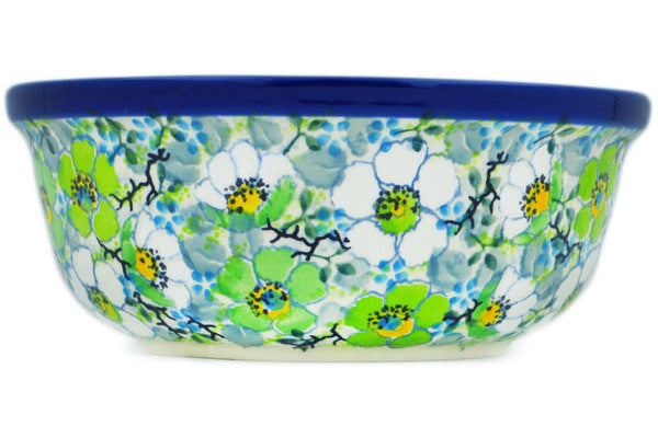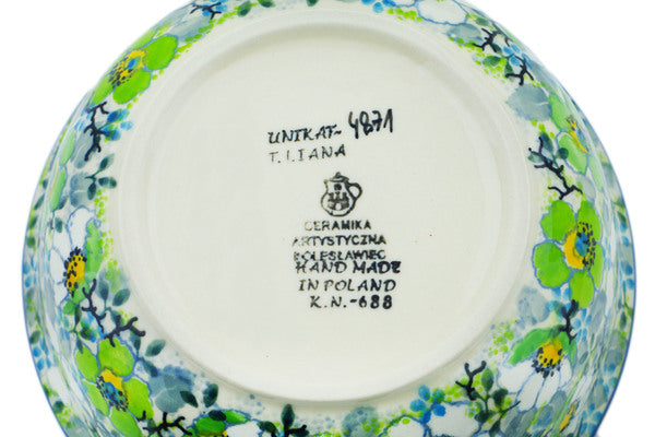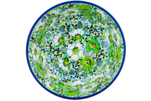 This Spearmint Fresh 6" Bowl was handmade and hand decorated in Boleslawiec, Poland by skilled artisans according to old traditional methods. This is a Polish pottery Signature Unikat, which means that it has been hand painted with both sponges and brushes and it is signed by the artist who painted it. Unikat pieces are the most intricate works of art. Larger Unikat items take hours of very careful work to finish. This Polish stoneware is microwave, dishwasher, freezer, and oven safe up to 480°F. It does not contain lead or cadmium. It is part of the Spearmint Fresh Collection.