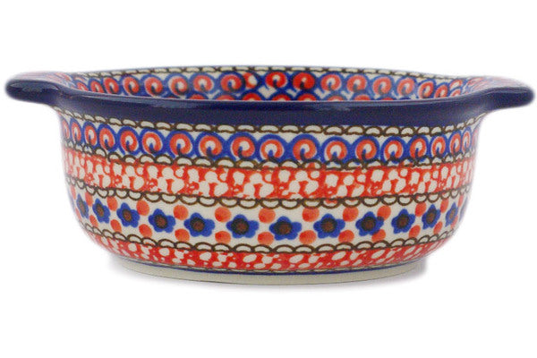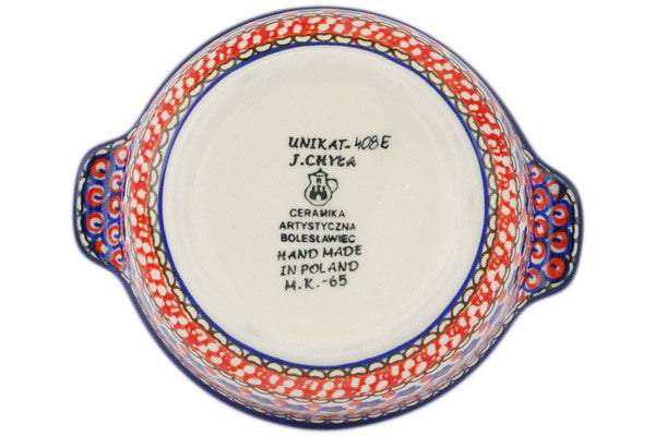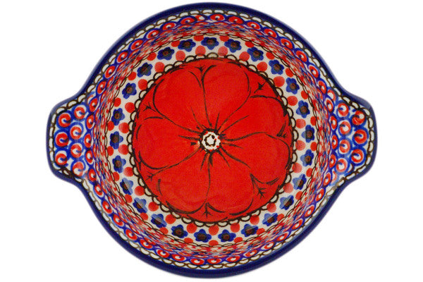 This Crimson Poppies 6" Bowl with Handles was handmade and hand decorated in Boleslawiec, Poland by skilled artisans according to old traditional methods. This is a Polish pottery Signature Unikat, which means that it has been hand painted with both sponges and brushes and it is signed by the artist who painted it. Unikat pieces are the most intricate works of art. Larger Unikat items take hours of very careful work to finish. This Polish stoneware is microwave, dishwasher, freezer, and oven safe up to 480°F. It does not contain lead or cadmium. It is part of the Crimson Poppies Collection.