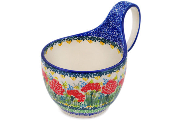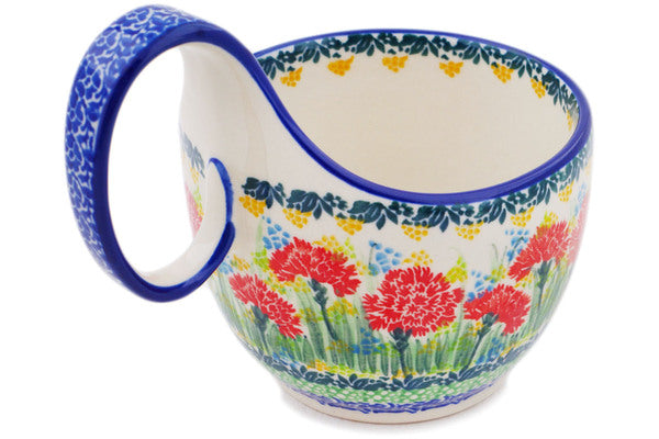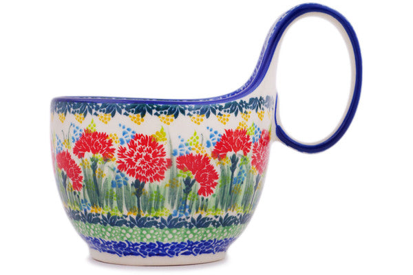 This Bright Carnations 16 oz Bowl with Loop-Handle was handmade and hand decorated in Boleslawiec, Poland by skilled artisans according to old traditional methods. This is a Polish pottery Signature Unikat, which means that it has been hand painted with both sponges and brushes and it is signed by the artist who painted it. Unikat pieces are the most intricate works of art. Larger Unikat items take hours of very careful work to finish. This Polish stoneware is microwave, dishwasher, freezer, and oven safe up to 480°F. It does not contain lead or cadmium. It is part of the Bright Carnations Collection.