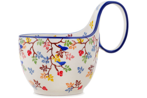 This Fall Branches 16 oz Bowl with Loop-Handle was handmade and hand decorated in Boleslawiec, Poland by skilled artisans according to old traditional methods. This is a Polish pottery Signature Unikat, which means that it has been hand painted with both sponges and brushes and it is signed by the artist who painted it. Unikat pieces are the most intricate works of art. Larger Unikat items take hours of very careful work to finish. This Polish stoneware is microwave, dishwasher, freezer, and oven safe up to 480°F. It does not contain lead or cadmium. It is part of the Fall Branches Collection.