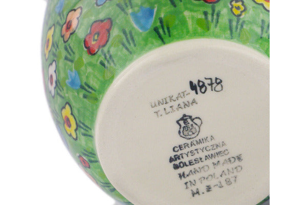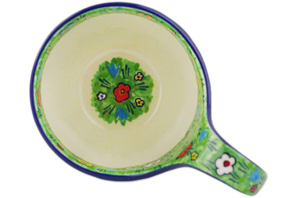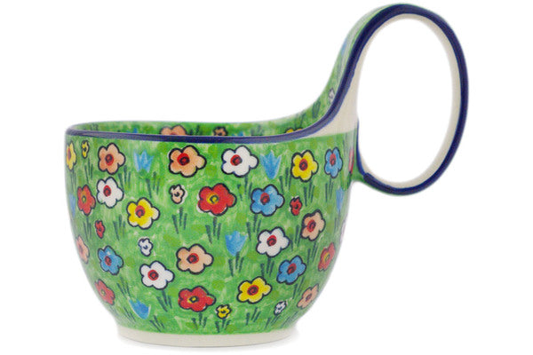 This Whimsical Garden 16 oz Bowl with Loop-Handle was handmade and hand decorated in Boleslawiec, Poland by skilled artisans according to old traditional methods. This is a Polish pottery Signature Unikat, which means that it has been hand painted with both sponges and brushes and it is signed by the artist who painted it. Unikat pieces are the most intricate works of art. Larger Unikat items take hours of very careful work to finish. This Polish stoneware is microwave, dishwasher, freezer, and oven safe up to 480°F. It does not contain lead or cadmium. It is part of the Whimsical Garden Collection.