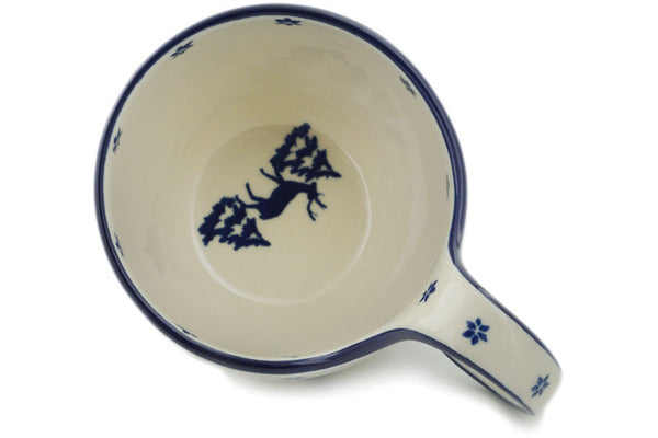 This Winter Deer 16 oz Bowl with Loop-Handle was handmade and hand decorated in Boleslawiec, Poland by skilled artisans according to old traditional methods. This Polish stoneware is microwave, dishwasher, freezer, and oven safe up to 480°F. It does not contain lead or cadmium. It is part of the Winter Deer Collection.