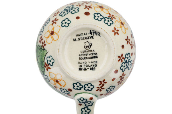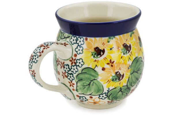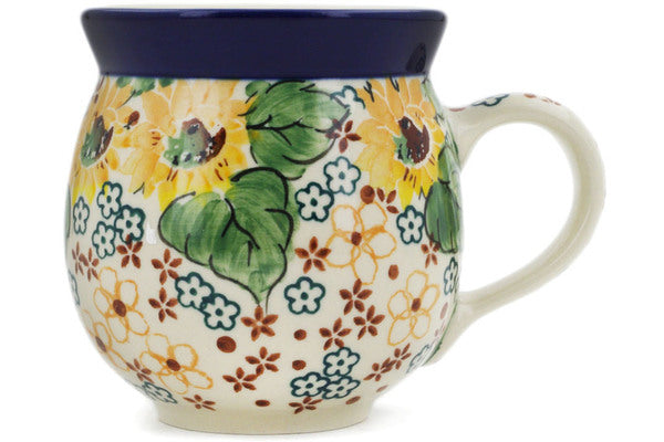 This Country Sunflower 12oz Bubble Mug was handmade and hand decorated in Boleslawiec, Poland by skilled artisans according to old traditional methods. This is a Polish pottery Signature Unikat, which means that it has been hand painted with both sponges and brushes and it is signed by the artist who painted it. Unikat pieces are the most intricate works of art. Larger Unikat items take hours of very careful work to finish. This Polish stoneware is microwave, dishwasher, freezer, and oven safe up to 480°F. It does not contain lead or cadmium. It is part of the Country Sunflower Collection.