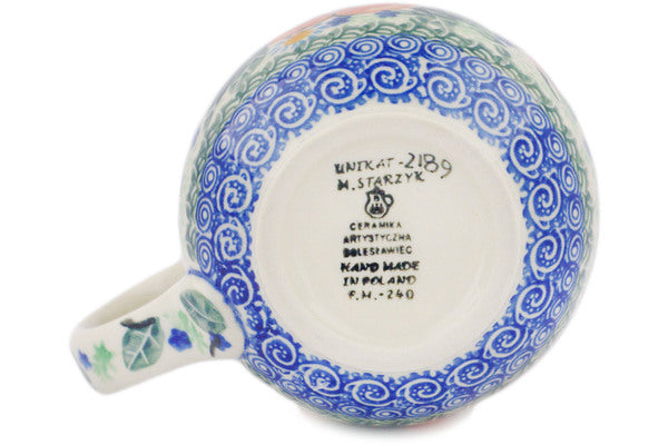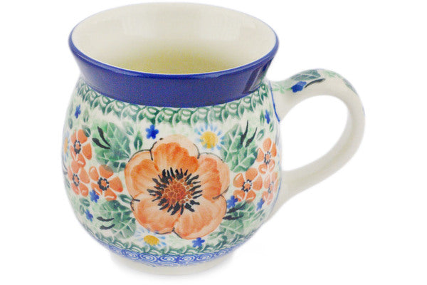 This Peach Poppy Wreath 16 oz Bubble Mug was handmade and hand decorated in Boleslawiec, Poland by skilled artisans according to old traditional methods. This is a Polish pottery Signature Unikat, which means that it has been hand painted with both sponges and brushes and it is signed by the artist who painted it. Unikat pieces are the most intricate works of art. Larger Unikat items take hours of very careful work to finish. This Polish stoneware is microwave, dishwasher, freezer, and oven safe up to 480°F. It does not contain lead or cadmium. It is part of the Peach Poppy Wreath Collection.