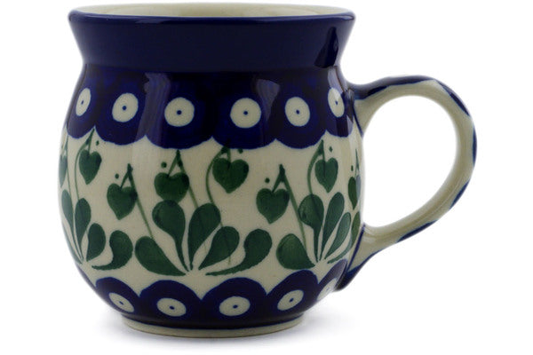 This Bleeding Heart Peacock 8 oz Bubble Mug was handmade and hand decorated in Boleslawiec, Poland by skilled artisans according to old traditional methods. This Polish stoneware is microwave, dishwasher, freezer, and oven safe up to 480°F. It does not contain lead or cadmium. It is part of the Bleeding Heart Peacock Collection.