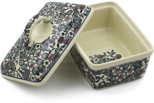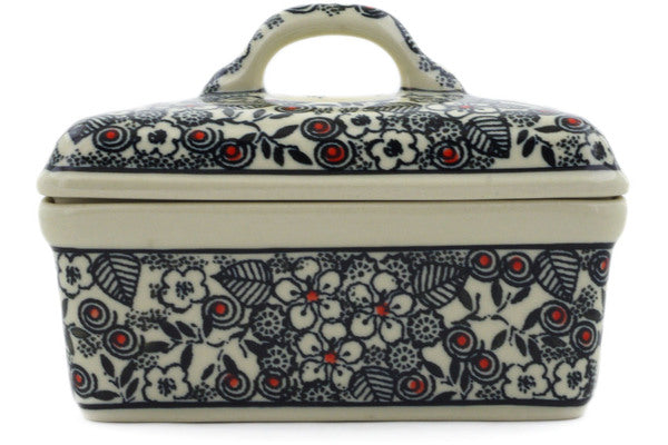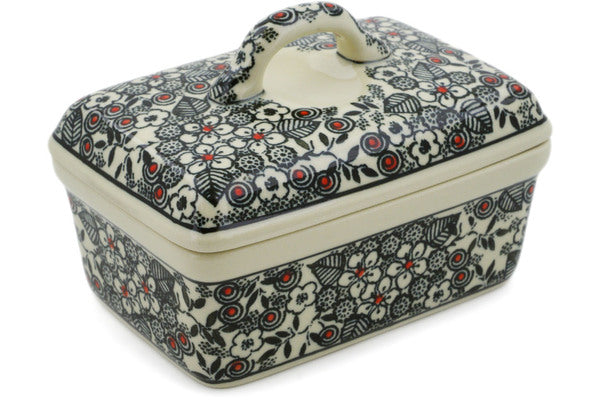 This Classic Black And White 5" Butter box was handmade and hand decorated in Boleslawiec, Poland by skilled artisans according to old traditional methods. This is a Polish pottery Signature Unikat, which means that it has been hand painted with both sponges and brushes and it is signed by the artist who painted it. Unikat pieces are the most intricate works of art. Larger Unikat items take hours of very careful work to finish. This Polish stoneware is microwave, dishwasher, freezer, and oven safe up to 480°F. It does not contain lead or cadmium. It is part of the Classic Black And White Collection.