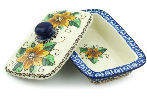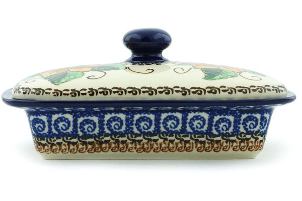 This Woodland Whirl 7" Butter Dish was handmade and hand decorated in Boleslawiec, Poland by skilled artisans according to old traditional methods. This is a Polish pottery Signature Unikat, which means that it has been hand painted with both sponges and brushes and it is signed by the artist who painted it. Unikat pieces are the most intricate works of art. Larger Unikat items take hours of very careful work to finish. This Polish stoneware is microwave, dishwasher, freezer, and oven safe up to 480°F. It does not contain lead or cadmium. It is part of the Woodland Whirl Collection.