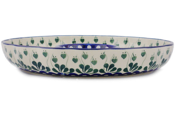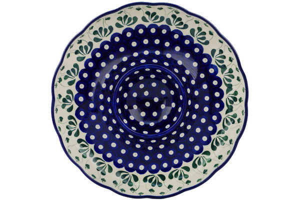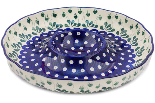 This Bleeding Heart Peacock 12" Chip and Dip Platter was handmade and hand decorated in Boleslawiec, Poland by skilled artisans according to old traditional methods. This Polish stoneware is microwave, dishwasher, freezer, and oven safe up to 480°F. It does not contain lead or cadmium. It is part of the Bleeding Heart Peacock Collection.