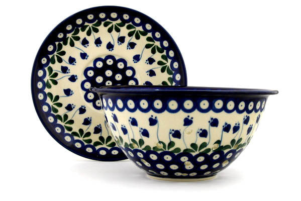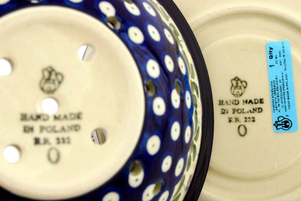 This Bleeding Heart Peacock 8" Colander with Plate was handmade and hand decorated in Boleslawiec, Poland by skilled artisans according to old traditional methods. This Polish stoneware is microwave, dishwasher, freezer, and oven safe up to 480°F. It does not contain lead or cadmium. It is part of the Bleeding Heart Peacock Collection.