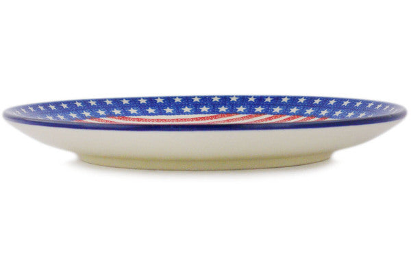This American Stars And Stripes 10½-inch Dinner Plate was handmade and hand decorated in Boleslawiec, Poland by skilled artisans according to old traditional methods. This Polish stoneware is microwave, dishwasher, freezer, and oven safe up to 480°F. It does not contain lead or cadmium. It is part of the American Stars And Stripes Collection.
