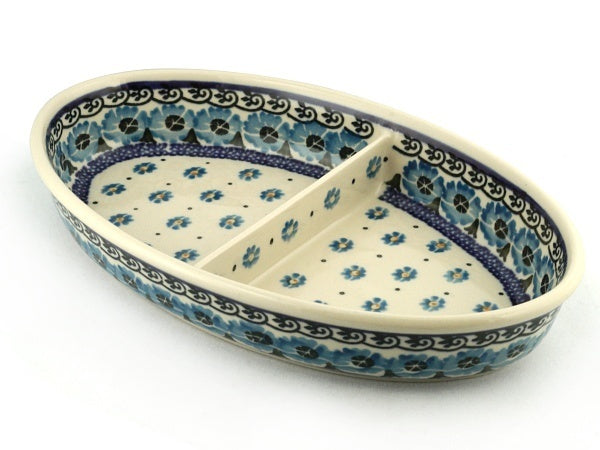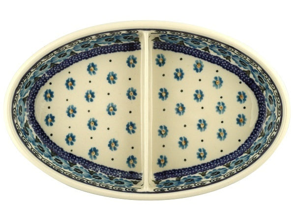 This Poppy Circle 11" Divided Dish was handmade and hand decorated in Boleslawiec, Poland by skilled artisans according to old traditional methods. This Polish stoneware is microwave, dishwasher, freezer, and oven safe up to 480°F. It does not contain lead or cadmium. It is part of the Poppy Circle Collection.