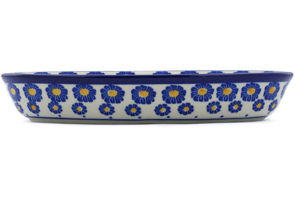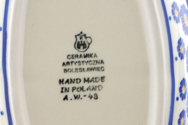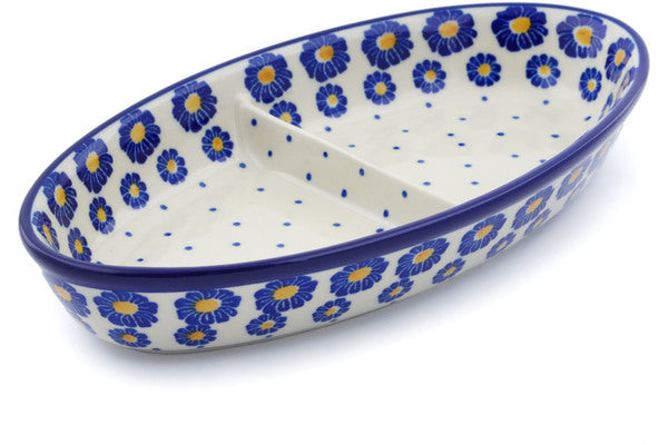 This Blue Zinnia 9" Divided Dish was handmade and hand decorated in Boleslawiec, Poland by skilled artisans according to old traditional methods. This Polish stoneware is microwave, dishwasher, freezer, and oven safe up to 480°F. It does not contain lead or cadmium. It is part of the Blue Zinnia Collection.