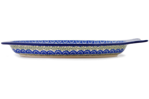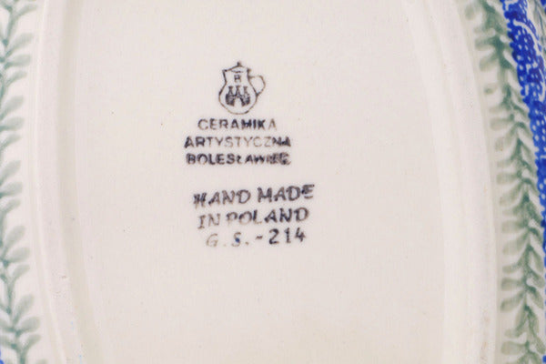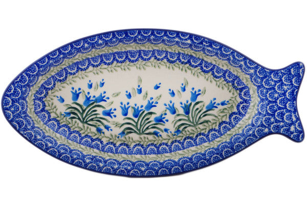 This Feathery Bluebells 12" Fish Shaped Platter was handmade and hand decorated in Boleslawiec, Poland by skilled artisans according to old traditional methods. This Polish stoneware is microwave, dishwasher, freezer, and oven safe up to 480°F. It does not contain lead or cadmium. It is part of the Feathery Bluebells Collection.