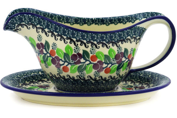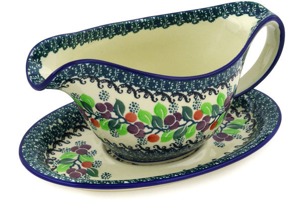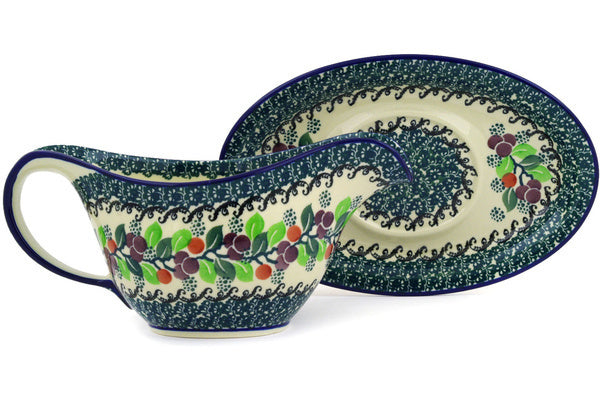This Berry Garland 20 oz Gravy Boat with Saucer was handmade and hand decorated in Boleslawiec, Poland by skilled artisans according to old traditional methods. This Polish stoneware is microwave, dishwasher, freezer, and oven safe up to 480°F. It does not contain lead or cadmium. It is part of the Berry Garland Collection.