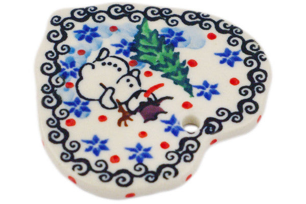 This Dancing Snowman 2" Heart Pendant was handmade and hand decorated in Boleslawiec, Poland by skilled artisans according to old traditional methods. This is a Polish pottery Signature Unikat, which means that it has been hand painted with both sponges and brushes and it is signed by the artist who painted it. Unikat pieces are the most intricate works of art. Larger Unikat items take hours of very careful work to finish. This Polish stoneware is microwave, dishwasher, freezer, and oven safe up to 480°F. It does not contain lead or cadmium. It is part of the Dancing Snowman Collection.