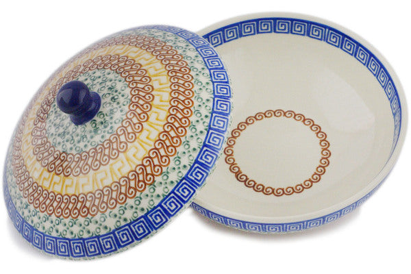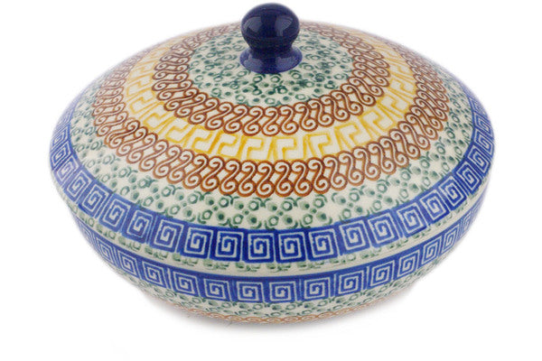 This Grecian Sea 7" Jar with Lid was handmade and hand decorated in Boleslawiec, Poland by skilled artisans according to old traditional methods. This Polish stoneware is microwave, dishwasher, freezer, and oven safe up to 480°F. It does not contain lead or cadmium. It is part of the Grecian Sea Collection.