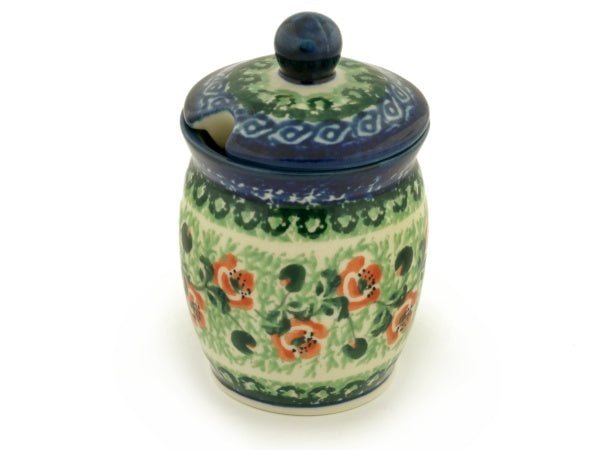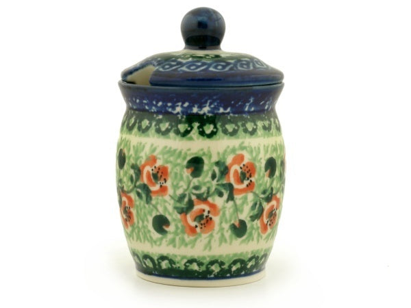 This Red Rose Buds 4" Jar with Lid with Opening was handmade and hand decorated in Boleslawiec, Poland by skilled artisans according to old traditional methods. This is a Polish pottery Signature Unikat, which means that it has been hand painted with both sponges and brushes and it is signed by the artist who painted it. Unikat pieces are the most intricate works of art. Larger Unikat items take hours of very careful work to finish. This Polish stoneware is microwave, dishwasher, freezer, and oven safe up to 480°F. It does not contain lead or cadmium. It is part of the Red Rose Buds Collection.