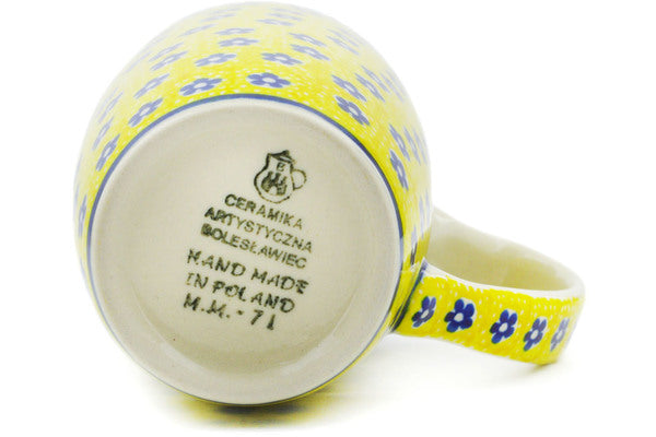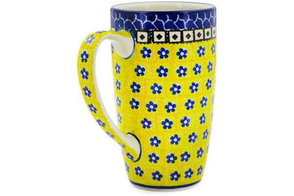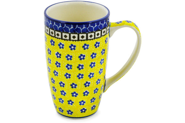 This Sunburst Daisies 14 oz Latte Mug was handmade and hand decorated in Boleslawiec, Poland by skilled artisans according to old traditional methods. This Polish stoneware is microwave, dishwasher, freezer, and oven safe up to 480°F. It does not contain lead or cadmium. It is part of the Sunburst Daisies Collection.