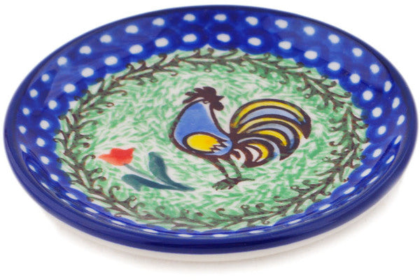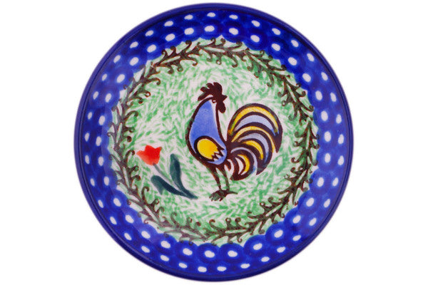 This Rooster Dance 4" Mini Plate, Coaster plate was handmade and hand decorated in Boleslawiec, Poland by skilled artisans according to old traditional methods. This is a Polish pottery Signature Unikat, which means that it has been hand painted with both sponges and brushes and it is signed by the artist who painted it. Unikat pieces are the most intricate works of art. Larger Unikat items take hours of very careful work to finish. This Polish stoneware is microwave, dishwasher, freezer, and oven safe up to 480°F. It does not contain lead or cadmium. It is part of the Rooster Dance Collection.