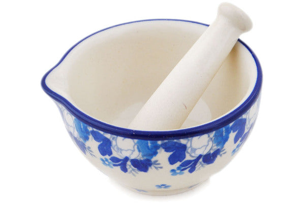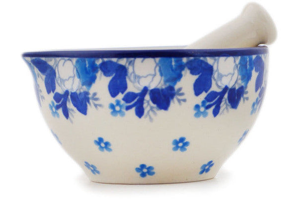 This Blue Spring Small Mortar and Pestle was handmade and hand decorated in Boleslawiec, Poland by skilled artisans according to old traditional methods. This Polish stoneware is microwave, dishwasher, freezer, and oven safe up to 480°F. It does not contain lead or cadmium. It is part of the Blue Spring Collection.