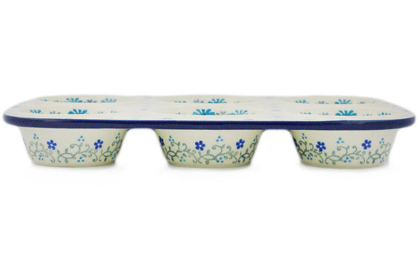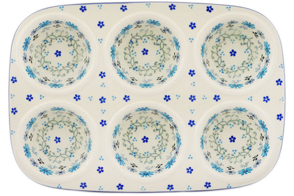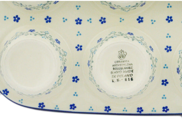 This Baby Blue Garden 11" Muffin Pan was handmade and hand decorated in Boleslawiec, Poland by skilled artisans according to old traditional methods. This Polish stoneware is microwave, dishwasher, freezer, and oven safe up to 480°F. It does not contain lead or cadmium. It is part of the Baby Blue Garden Collection.
