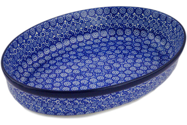 This Wagon Wheel 12" Oval Baker was handmade and hand decorated in Boleslawiec, Poland by skilled artisans according to old traditional methods. This Polish stoneware is microwave, dishwasher, freezer, and oven safe up to 480°F. It does not contain lead or cadmium. It is part of the Wagon Wheel Collection.