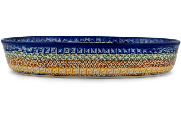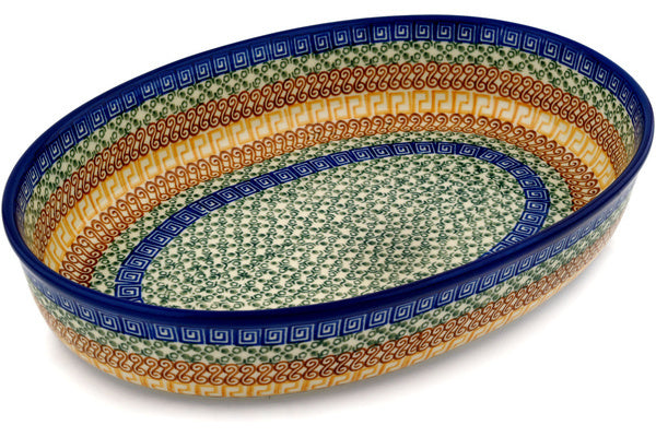 This Grecian Sea 14" Oval Baker was handmade and hand decorated in Boleslawiec, Poland by skilled artisans according to old traditional methods. This Polish stoneware is microwave, dishwasher, freezer, and oven safe up to 480°F. It does not contain lead or cadmium. It is part of the Grecian Sea Collection.