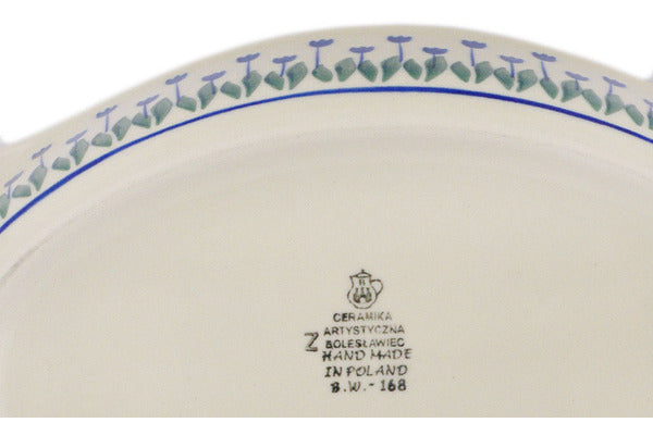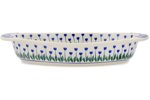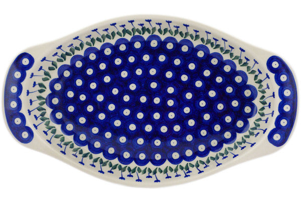 This Blue Tulip Peacock 13" Oval Baker with Handles was handmade and hand decorated in Boleslawiec, Poland by skilled artisans according to old traditional methods. This Polish stoneware is microwave, dishwasher, freezer, and oven safe up to 480°F. It does not contain lead or cadmium. It is part of the Blue Tulip Peacock Collection.