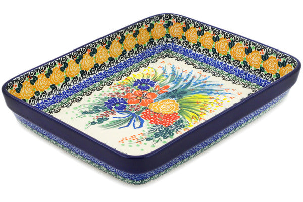 This Iris Bouquet 11" Rectangular Baker was handmade and hand decorated in Boleslawiec, Poland by skilled artisans according to old traditional methods. This is a Polish pottery Signature Unikat, which means that it has been hand painted with both sponges and brushes and it is signed by the artist who painted it. Unikat pieces are the most intricate works of art. Larger Unikat items take hours of very careful work to finish. This Polish stoneware is microwave, dishwasher, freezer, and oven safe up to 480°F. It does not contain lead or cadmium. It is part of the Iris Bouquet Collection.