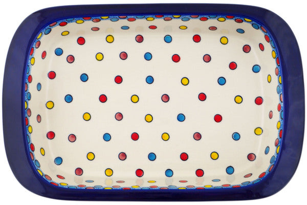 This Gumball Machine 13" Rectangular Baker was handmade and hand decorated in Boleslawiec, Poland by skilled artisans according to old traditional methods. This is a Polish pottery Signature Unikat, which means that it has been hand painted with both sponges and brushes and it is signed by the artist who painted it. Unikat pieces are the most intricate works of art. Larger Unikat items take hours of very careful work to finish. This Polish stoneware is microwave, dishwasher, freezer, and oven safe up to 480°F. It does not contain lead or cadmium. It is part of the Gumball Machine Collection.