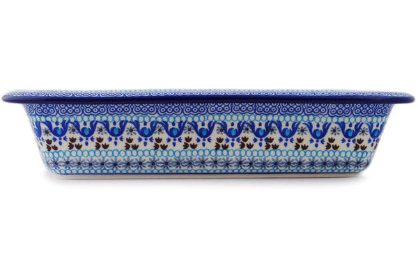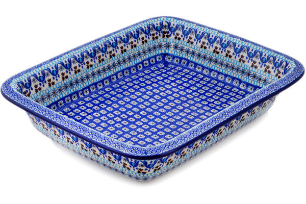 This Blue Ice 14" Rectangular Baker was handmade and hand decorated in Boleslawiec, Poland by skilled artisans according to old traditional methods. This Polish stoneware is microwave, dishwasher, freezer, and oven safe up to 480°F. It does not contain lead or cadmium. It is part of the Blue Ice Collection.