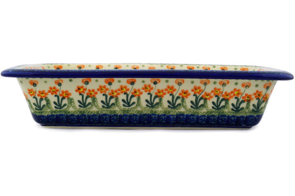This Peach Spring Daisy 14" Rectangular Baker was handmade and hand decorated in Boleslawiec, Poland by skilled artisans according to old traditional methods. This Polish stoneware is microwave, dishwasher, freezer, and oven safe up to 480°F. It does not contain lead or cadmium. It is part of the Peach Spring Daisy Collection.