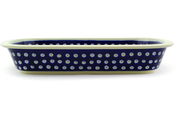 This Blue Eyes 12-inch Rectangular Baker with Grip Lip was handmade and hand decorated in Boleslawiec, Poland by skilled artisans according to old traditional methods. This Polish stoneware is microwave, dishwasher, freezer, and oven safe up to 480°F. It does not contain lead or cadmium. It is part of the Blue Eyes Collection.