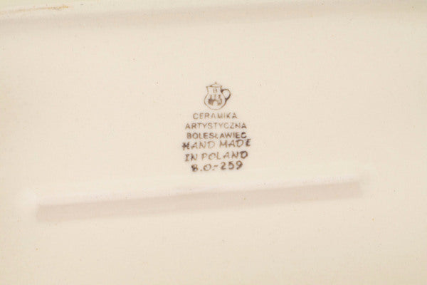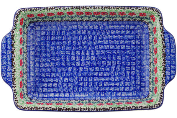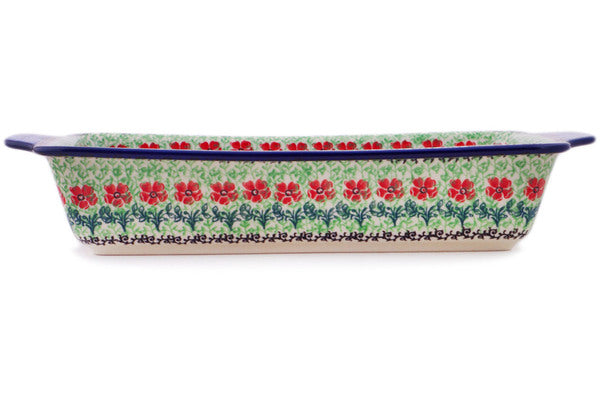 This Maraschino 13" Rectangular Baker with Handles was handmade and hand decorated in Boleslawiec, Poland by skilled artisans according to old traditional methods. This Polish stoneware is microwave, dishwasher, freezer, and oven safe up to 480°F. It does not contain lead or cadmium. It is part of the Maraschino Collection.