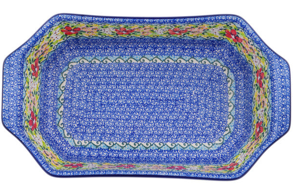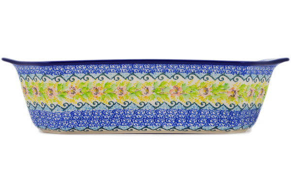 This Petal Dance 14" Rectangular Baker with Handles was handmade and hand decorated in Boleslawiec, Poland by skilled artisans according to old traditional methods. This is a Polish pottery Signature Unikat, which means that it has been hand painted with both sponges and brushes and it is signed by the artist who painted it. Unikat pieces are the most intricate works of art. Larger Unikat items take hours of very careful work to finish. This Polish stoneware is microwave, dishwasher, freezer, and oven safe up to 480°F. It does not contain lead or cadmium. It is part of the Petal Dance Collection.