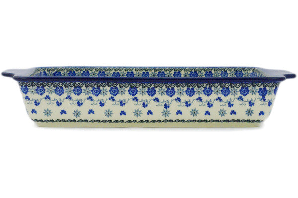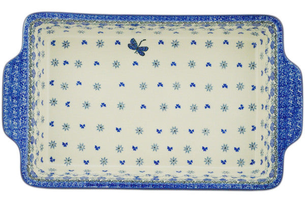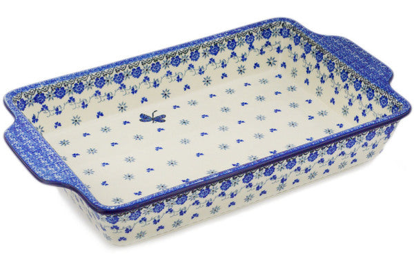 This Spring Dragonfly 15" Rectangular Baker with Handles was handmade and hand decorated in Boleslawiec, Poland by skilled artisans according to old traditional methods. This Polish stoneware is microwave, dishwasher, freezer, and oven safe up to 480°F. It does not contain lead or cadmium. It is part of the Spring Dragonfly Collection.