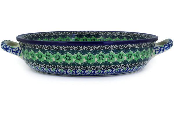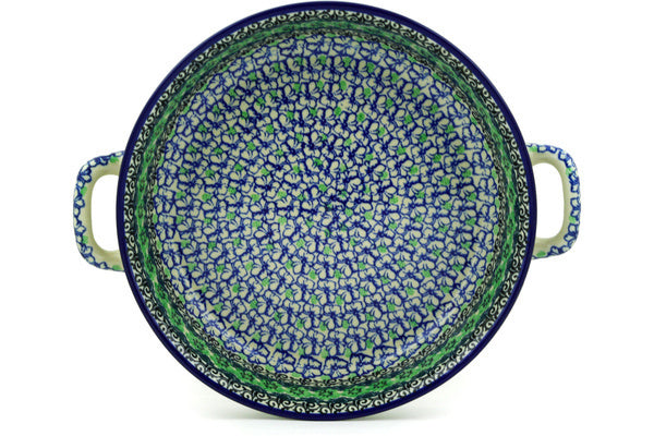 This Kiwi Flower Medium Round Baker with Handles 10-inch was handmade and hand decorated in Boleslawiec, Poland by skilled artisans according to old traditional methods. This Polish stoneware is microwave, dishwasher, freezer, and oven safe up to 480°F. It does not contain lead or cadmium. It is part of the Kiwi Flower Collection.