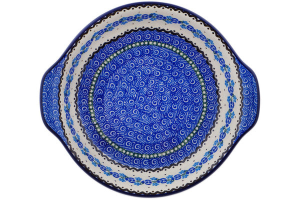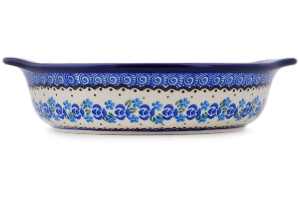 This Blue Bud Sea 9" Round Baker with Handles was handmade and hand decorated in Boleslawiec, Poland by skilled artisans according to old traditional methods. This Polish stoneware is microwave, dishwasher, freezer, and oven safe up to 480°F. It does not contain lead or cadmium. It is part of the Blue Bud Sea Collection.