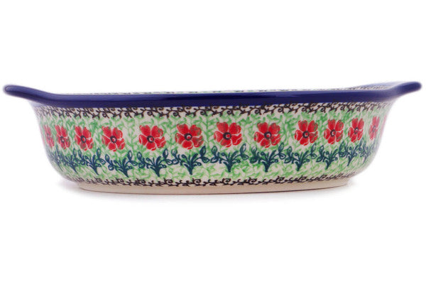 This Maraschino 9" Round Baker with Handles was handmade and hand decorated in Boleslawiec, Poland by skilled artisans according to old traditional methods. This Polish stoneware is microwave, dishwasher, freezer, and oven safe up to 480°F. It does not contain lead or cadmium. It is part of the Maraschino Collection.