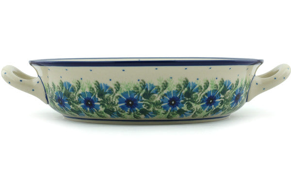 This Blue Bell Wreath Medium Round Baker with Handles was handmade and hand decorated in Boleslawiec, Poland by skilled artisans according to old traditional methods. This Polish stoneware is microwave, dishwasher, freezer, and oven safe up to 480°F. It does not contain lead or cadmium. It is part of the Blue Bell Wreath Collection.