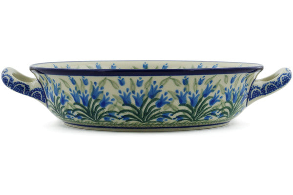 This Feathery Tulips Medium Round Baker with Handles was handmade and hand decorated in Boleslawiec, Poland by skilled artisans according to old traditional methods. This Polish stoneware is microwave, dishwasher, freezer, and oven safe up to 480°F. It does not contain lead or cadmium. It is part of the Feathery Tulips Collection.