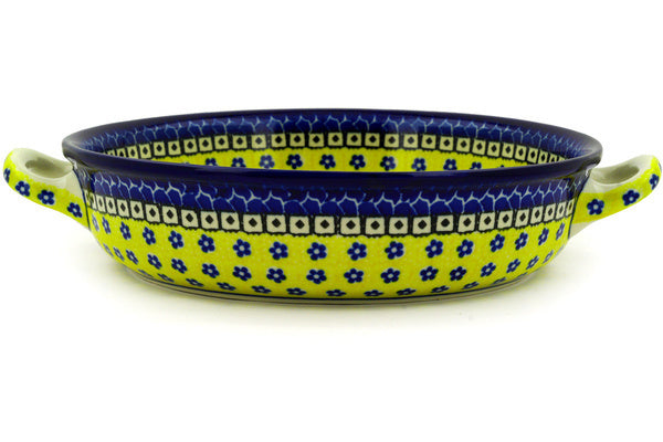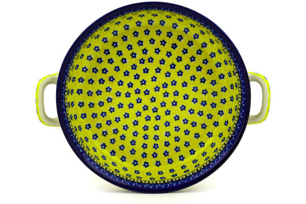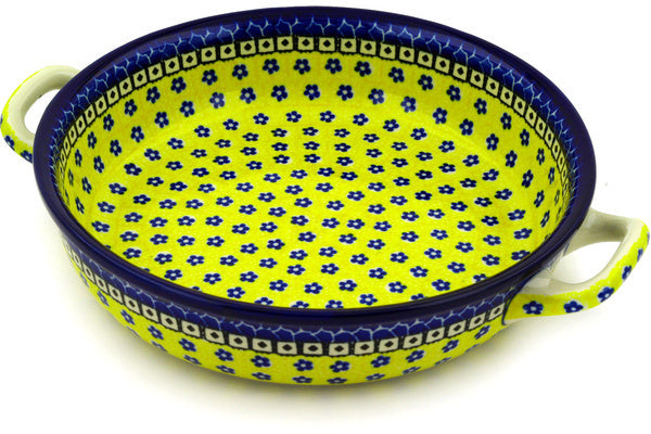 This Sunburst Daisies Medium Round Baker with Handles 10-inch was handmade and hand decorated in Boleslawiec, Poland by skilled artisans according to old traditional methods. This Polish stoneware is microwave, dishwasher, freezer, and oven safe up to 480°F. It does not contain lead or cadmium. It is part of the Sunburst Daisies Collection.