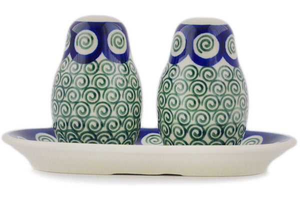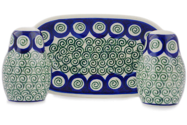 This Green Peacock Swirl 7" Salt and Pepper 3-Piece Set was handmade and hand decorated in Boleslawiec, Poland by skilled artisans according to old traditional methods. This Polish stoneware is microwave, dishwasher, freezer, and oven safe up to 480°F. It does not contain lead or cadmium. It is part of the Green Peacock Swirl Collection.