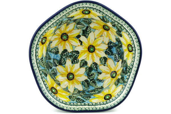 This Black Eyed Susan 10" Scalloped Bowl was handmade and hand decorated in Boleslawiec, Poland by skilled artisans according to old traditional methods. This is a Polish pottery Signature Unikat, which means that it has been hand painted with both sponges and brushes and it is signed by the artist who painted it. Unikat pieces are the most intricate works of art. Larger Unikat items take hours of very careful work to finish. This Polish stoneware is microwave, dishwasher, freezer, and oven safe up to 480°F. It does not contain lead or cadmium. It is part of the Black Eyed Susan Collection.