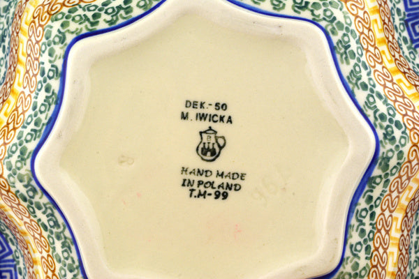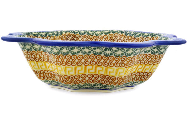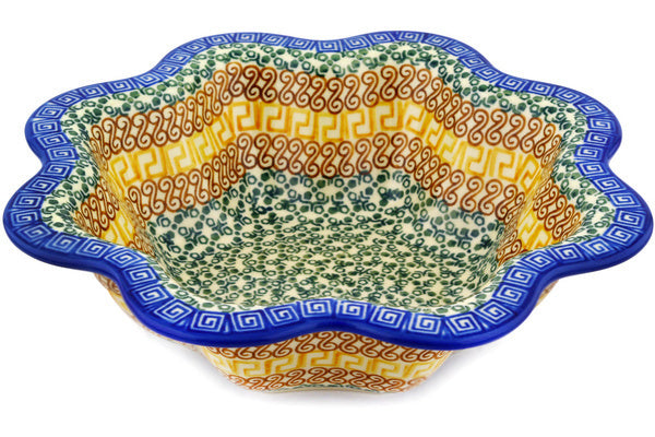 This Grecian Sea 10" Scalloped Fluted Bowl was handmade and hand decorated in Boleslawiec, Poland by skilled artisans according to old traditional methods. This Polish stoneware is microwave, dishwasher, freezer, and oven safe up to 480°F. It does not contain lead or cadmium. It is part of the Grecian Sea Collection.
