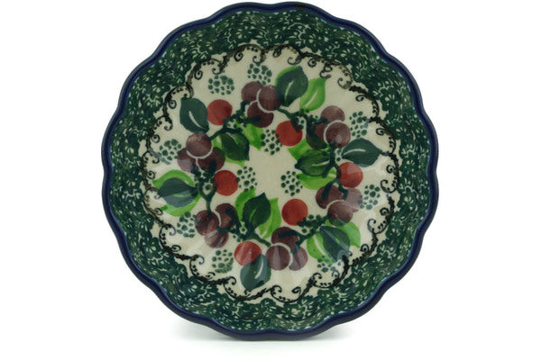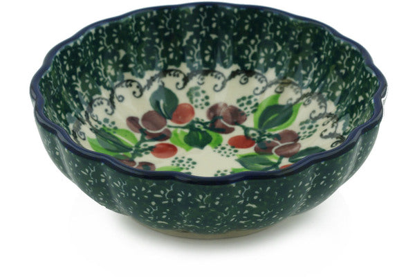 This Berry Garland 5" Scalloped Fluted Bowl was handmade and hand decorated in Boleslawiec, Poland by skilled artisans according to old traditional methods. This Polish stoneware is microwave, dishwasher, freezer, and oven safe up to 480°F. It does not contain lead or cadmium. It is part of the Berry Garland Collection.